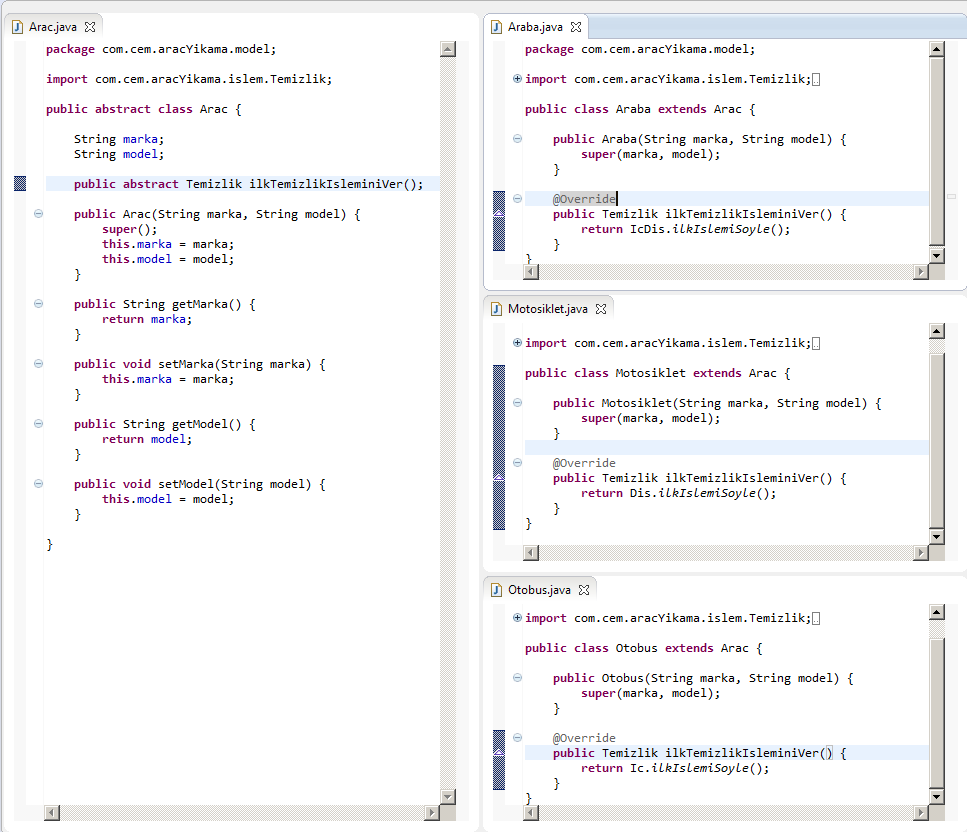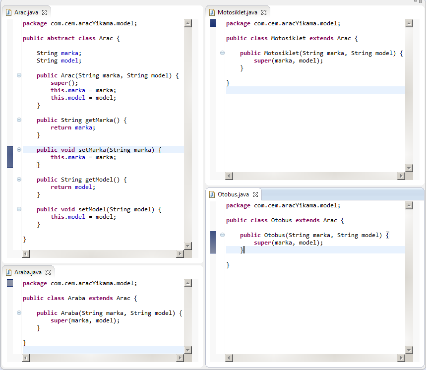 Hemen modellerimizi yaratarak işe başlayalım. Abstract bir Arac sınıfı ve bu sınıfı kalıtan Otobus, Araba ve Motosiklet sınıfları yaratıyorum. İlk adımda görüntümüz aşağıdaki şekilde;