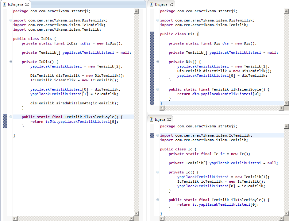 Peki burada ne yaptık. İlk önce şunu belirteyim, bu stratejileri 1 kez yaratılmasını istiyorum, lakin her araba geldiğinde tekrar tekrar strateji yaratmakla uğraşmamamız lazım. Bu sebeple stratejilerimiz singleton(tekillik) tasarım şablonuna uygun olacak şekilde yaratıldı. İç dış örneğinden devam edecek olursak, o zaman bir tane iç bir tane de dış temizliği yapan işlemlere ihtiyacım var ki bu işlemleri temizle metotları aracılığıyla yapan sınıflarımızı az önce yaratmıştık. O zaman bu sınıflarımızdan birer örnek alalım ve stratejimize yerleştirelim. Ve her Temizlik sınıfının da kendisinden sonra yapılacak işlemin ne olduğunu bilmesini sağlayalım. Yani sıradaki işlemi ata metoduyla dış temizlik sınıfı kendisinden sonra iç temizlik yapılacağını biliyor olsun.