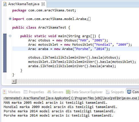 Baya bir kod yazdık, artık sona yaklaşıyoruz. Şu anda elimizde araçlarımız ve bu araçların kalıttığı abstract bir Arac sınıfımız, Temizlik abstract sınıfından türetilmiş ve temizle metotlarına sahip temizlik türlerimiz ve araçlar için kullanılabilir durumda temizlik stratejilerimiz var.