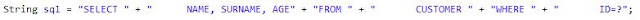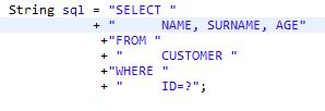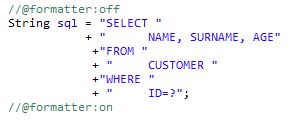 Formatter her ne kadar kullanışlı bir araç olsa da kimi zaman kodumuzun bazı parçalarının formatlanMAmasını isteriz. Özellikle de DAO’lar içerisinde yer alan SQL stringleri formatlandığında SQL’in kendi formatına değil, Eclipse’in diğer kodlarımız için oluşturduğu her satır için atanan karakter adedine göre formatladığı için SQL’i okumak söz konusu olduğunda çileden çıkaran bir durumla karşılaşabiliyoruz. En basitinden bir örnek verelim;