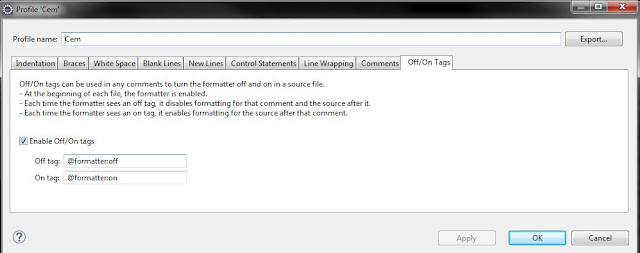 Yani tüm kodu seç, formatla ve kaydet. Window > Preferences > Java > Code Style > Formatter menüsünde kendi profilinizi editleyin ve tabların en sonunda Off/On Tags tabında Enable Off/On tags’ı seçin. Default olarak @formatter:off ve @formatter:on taglerini kendi istediğiniz kelimelerle de değiştirebilirsiniz.