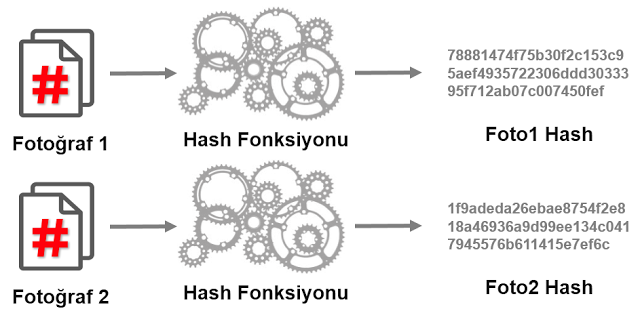 İçeriğin kendisinden adreslemenin yaratılması kavramını biraz açalım. Ama önce #Hash kavramını açıklamamız lazım. Hash fonksiyonları kabaca, farklı büyüklüklerdeki veri kümelerinin sabit uzunlukta bir veri kümelerine adresleyen algoritmalara verilen addır. Yani elinizde bir fotoğrafınız var ve siz hash fonksiyonundan geçirdiğinizde o fotoğrafı tanımlayan ve her defasında aynı uzunlukta oluşan bir text(hash) ile o fotoğrafı tekil olarak tanımlarsınız. Aynı veriyi ne zaman hash fonksiyonundan geçirirseniz geçirin her defasında aynı hash üreyecektir.