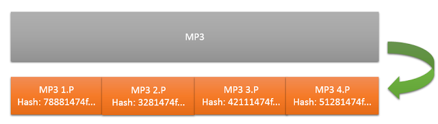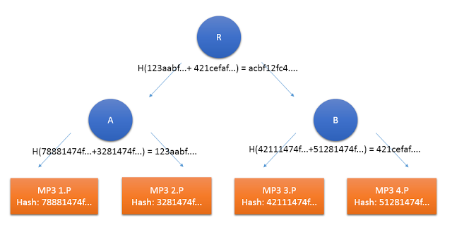 Bu ağaç yapısı şu işe yarar, eğer siz mp3ün 2. parçasını değiştirmeye çalışırsanız buradaki parçanın hash değeri başka bir değer olacaktır. A leaf’i de 1. ve 2. parçaların hashlerinden oluşan bir hashe sahip olduğundan dolayı bambaşka bir hash oluşacaktır, bu döngü en tepedeki R düğümüne kadar ulaşacaktır. Özetle mp3ün herhangi bir parçasında değişiklik gerçekleştiği takdirde R düğümü bambaşka bir hash koduna sahip olacaktır ve bu sebeple orjinal dosyanın Merkle Root hashinden farklı bir hash üreyecektir. Orjinal dosyanın Merkle Treesi ile rootdan leaflere doğru karşılaştırma yapılarak değişiklik yapılan veri adreslenebilir olur.