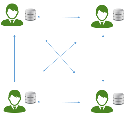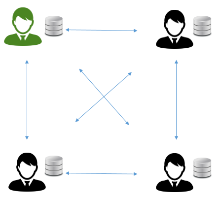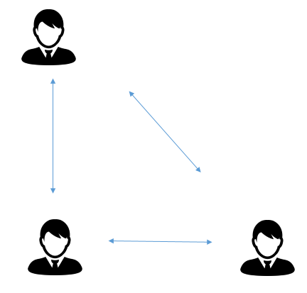 Hemen konuya giriyorum, üniversitede öğrenciler olduğumuzu ve bir proje yetiştirmeye çalıştığımızı varsayalım. Bu proje için 3 arkadaş bir araya gelip birlikte yapmaya karar verdik. Çalışırken de birbirimizle yazdığımız dokümanları, bulduğumuz görselleri paylaşma ihtiyacımız var. Bu paylaşımı sağlamak ve bu içeriklerin saklanması ihtiyacını karşılayan 3 katılımcıdan oluşan bir Blockchain ağımız olsun. Her birimiz harıl harıl çalışıyoruz ve içerik üretiyoruz/buluyoruz. 3 arkadaş buldukları/ürettikleri içerikleri blockchain ağına vermek suretiyle birbirleriyle sürekli iletişim halindeler. Ağın en basit haliyle görüntüsü aşağıdaki gibi olacaktır.