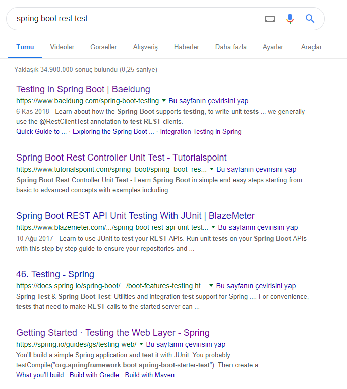 Post metod açan bu sınıfımızın testini nasıl yazmalıyız? Google’da “spring boot rest test” anahtar kelimeleri ile aramamızı yaptığımızda çıkan 5 site aşağıdaki gibi. Bunlardan ikisi de Spring’in kendi sitesi :)