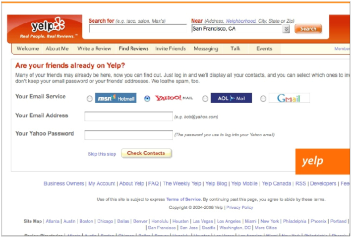 Bu çalışmalar devam ederken 2007 yılında ilgili ilginç bir gelişme yaşanmıştı. Eski PayPal çalışanları Jeremy Stoppelman ve Russel Simmons’un bir girişimi olan Yelp, yerel işletmeler hakkında kullanıcıların deneyimlerini paylaştıkları bir site geliştirdiler. Sitenin kullanımını artırabilmek için önemli bir nokta vardı, insanlar kendi çevresindeki arkadaşlarının yorumlarını daha çok önemsiyorlardı. Bir şekilde üye profillerin kendi arkadaş çevresindeki kişilerle etkileşiminin artırılması gerekiyordu ancak kimin kiminle arkadaş olduğu bilinmiyordu.