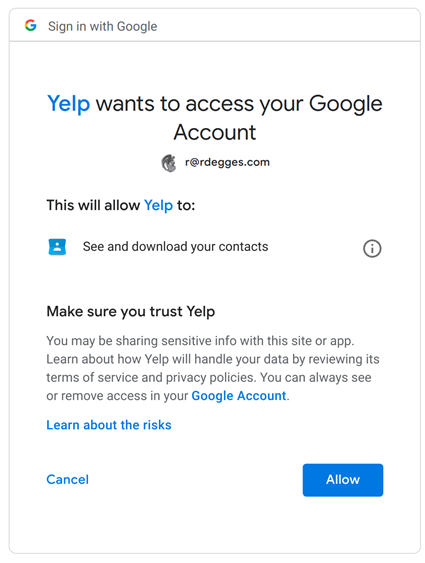 Gerçekten de bütün bu uğraşlar sonuç buldu. Hatta o kadar çok insan sonuçlarını düşünmeden bu sistemi kullandı ki oluşan güvenlik açığı büyük şirketlerin tepkisini çekti. Tehlike şuydu; kullanıcılar authentication amacıyla verdikleri gerçek hesap kullanıcı ve şifreleri ile Yelp uygulamasına sınırsız erişim yetkisi veriyorlardı. Yelp bu bilgilerle kullanıcıların tüm maillerine, konuşma geçmişlerine, iletişim bilgilerine, güvenlik tercihlerine ve daha nicelerine erişim yetkisi elde ediyordu. Aslında ihtiyaç duyulan sadece arkadaş listesine erişebilmek iken kullanıcının tüm tercihlerini değiştirebilecek bir yetkiye sahip olmak doğru kurgulanmamış bir authorization kurgusundan başka bir şey değildi.